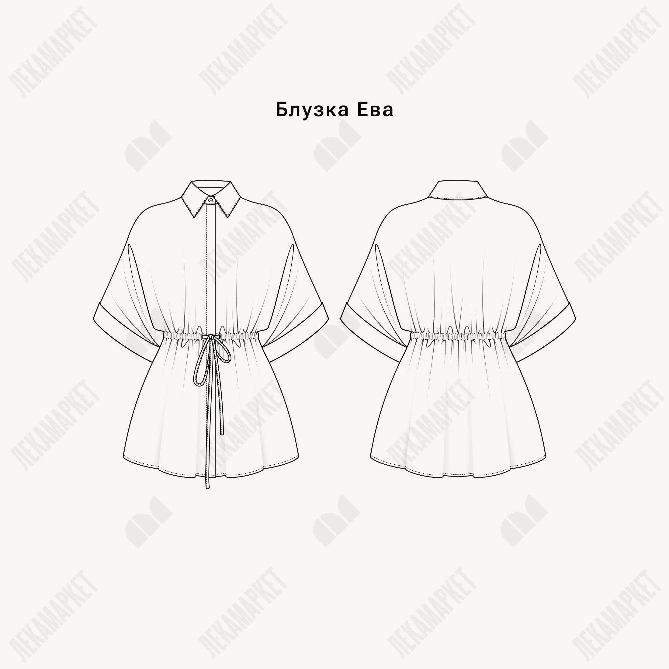 Блузка с цельнокроенными рукавами, среднего объема, приталенная за счет кулисы. Блузка длиной ниже линии бедер. По полочке и спинке на уровне талии расположена кулиса, внутри которой проходит шнур, продетый через петли. Блузка с цельнокроенными широкими рукавами, длиной чуть ниже линии локтя. По низу рукава расположены притачные манжеты с отворотом. На полочках – центральная супатная застежка на обметанные петли и пуговицы. Воротник — отложной, на стойке. Низ изделия фигурный, закругленной формы к боковым швам.