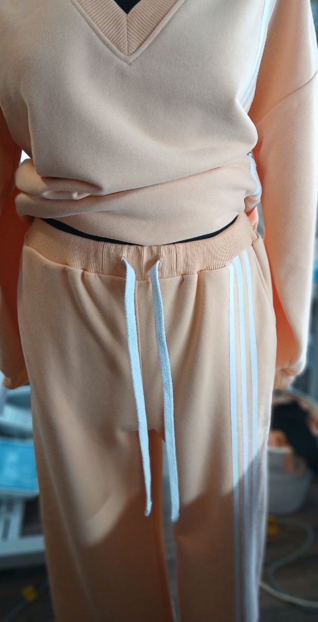 Брюки на фото были выполнены из футера 3-х ниточного. Материал растяжимый, мягкий, пластичный. На пояс использовано кашкорсе.
