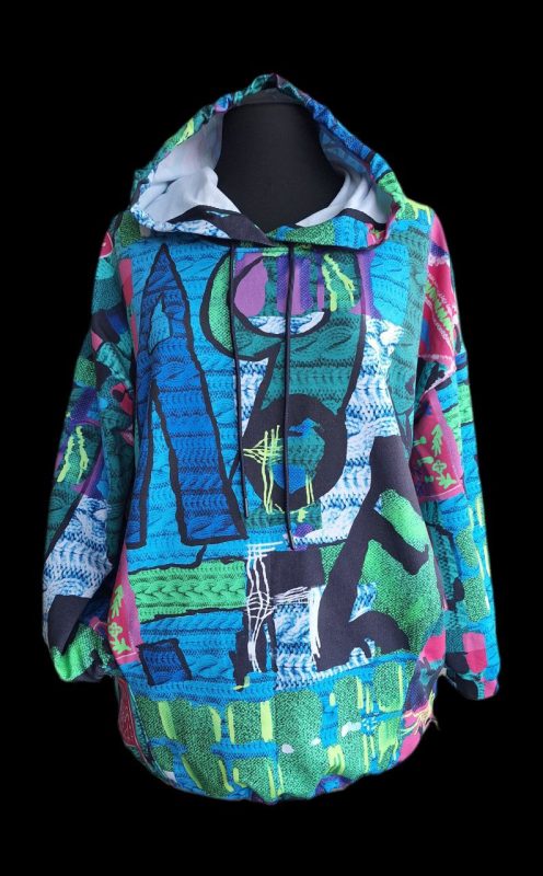 Худи свободного силуэта, длиной ниже линии бедер, с капюшоном. На полочке – рельефные швы, выходящие из боковых швов, в рельефных швах обработаны карманы. Рукава – втачные, состоящие из трех частей. Линия плеча спущена на 13-19 см. Капюшон на подкладке — объемный, состоящий из трех деталей. По переднему краю капюшона – кулиса, в которую вставлен отделочный шнур, продетый через люверсы. По низу рукава и низу худи кулиса, в которую вставлена шляпная резинка, продетая через люверсы и фиксаторы. В рельефные швы полочки, рельефные швы рукава, швы стачивания частей капюшона вставлен отделочный кант.