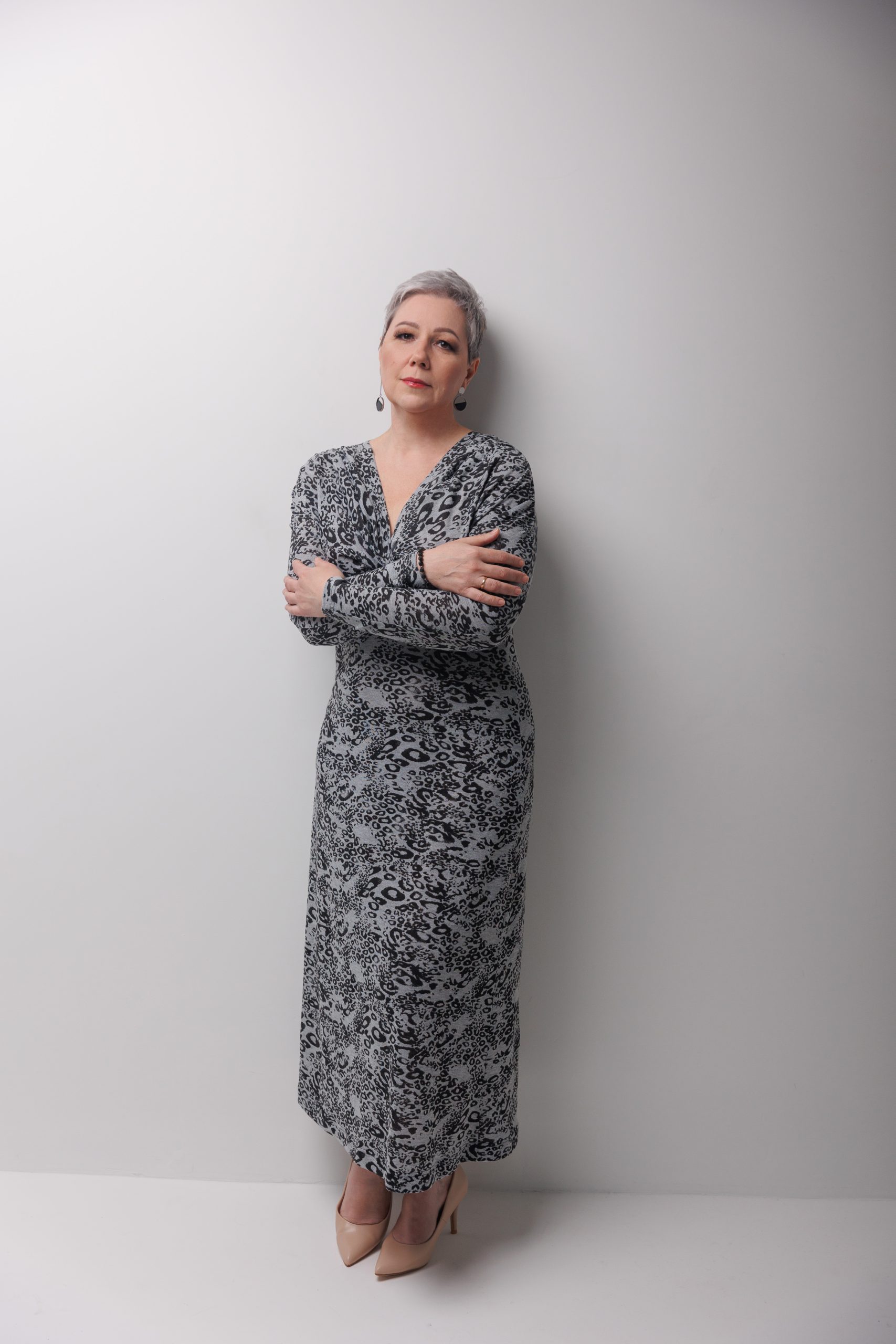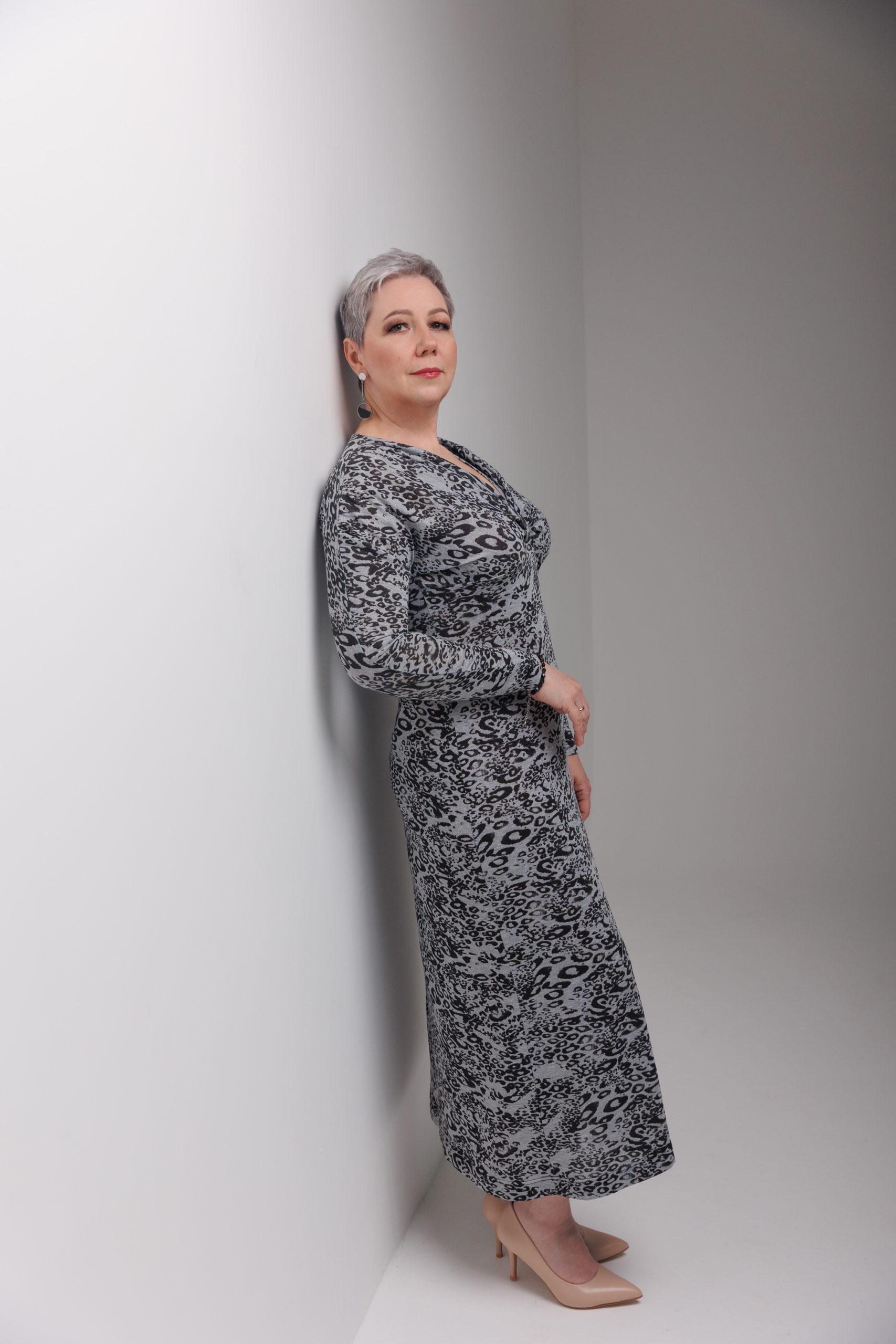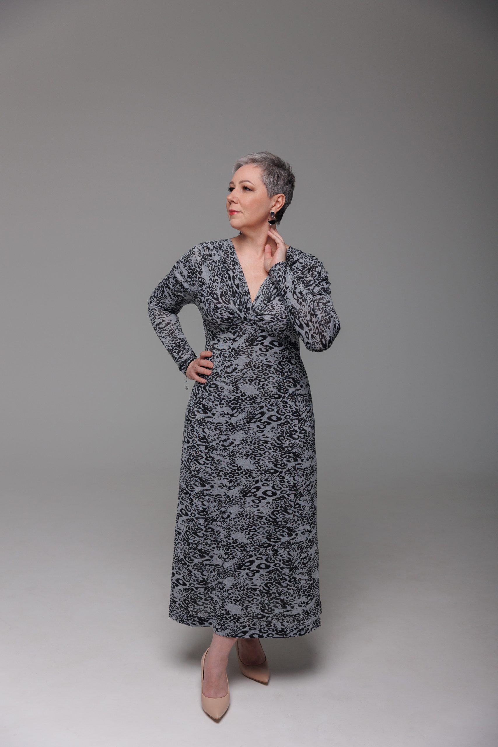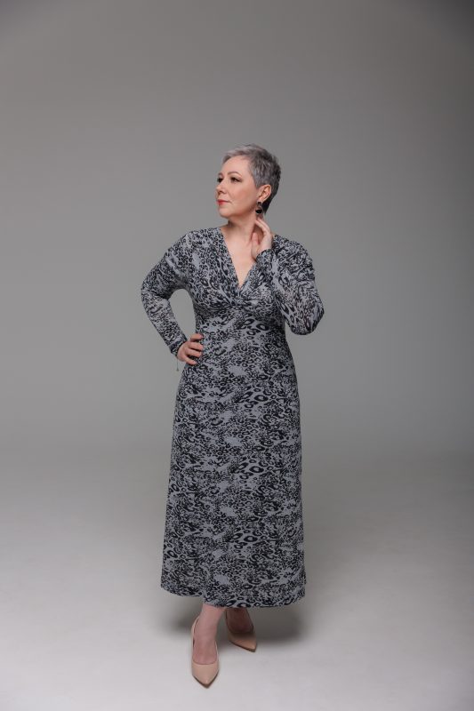 Платье малого объема с цельновыкроенными рукавами, приталенного силуэта. Полочка платья состоит из двух деталей: верхней части полочки и полочки. Вырез горловины глубокий, V-образный. На верхней части полочки, на уровне груди – декоративный перекрученный узел. Рукава – цельновыкроенные, длинные, малого объёма. По плечевым швам полочки и верхним швам рукавов в верхней части предусмотрена сборка. Горловина изделия обработана плоским швом. Длина платья до щиколотки.