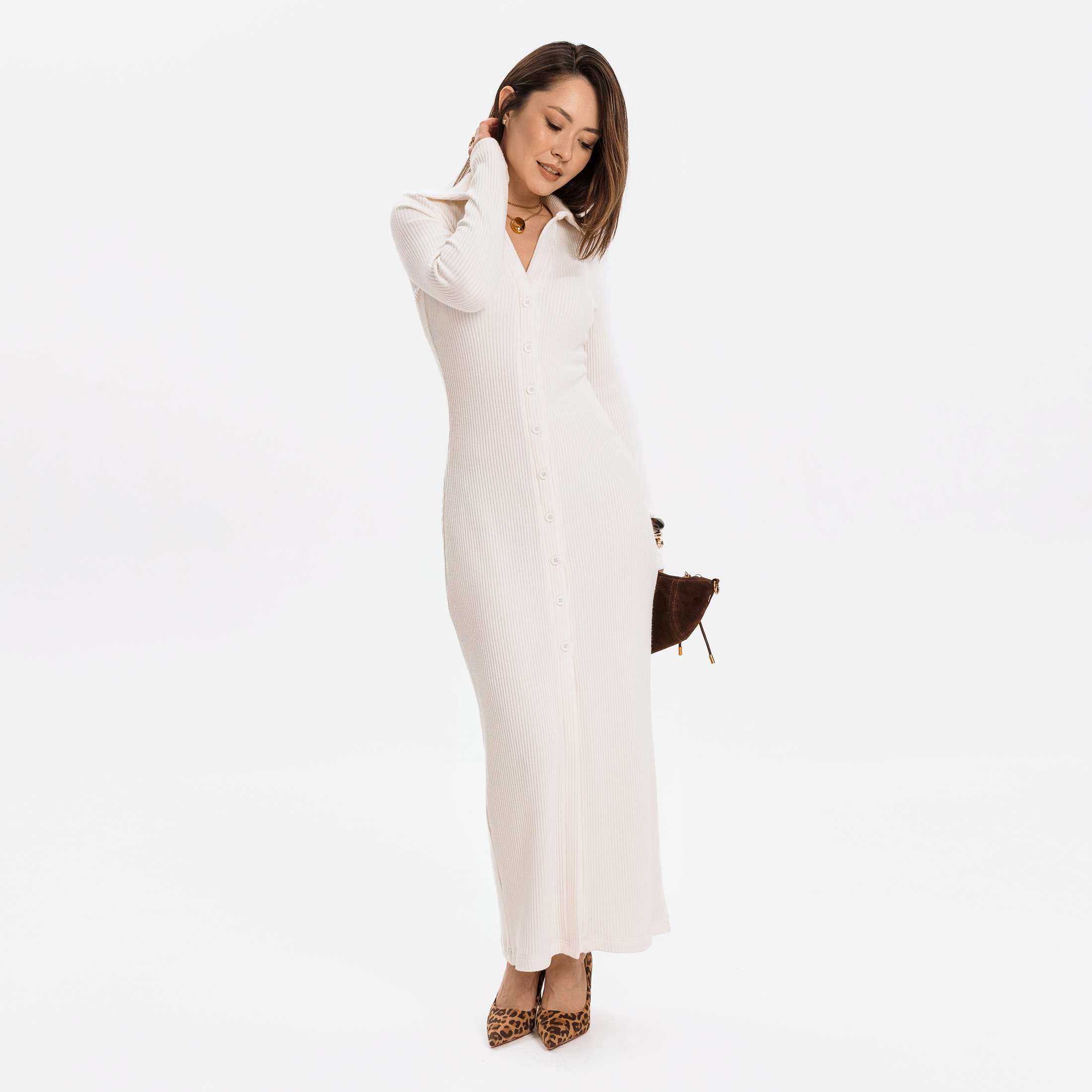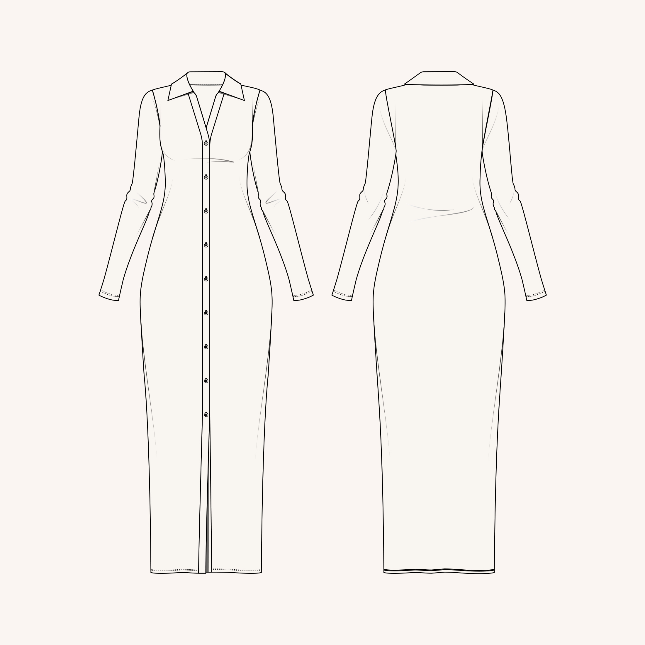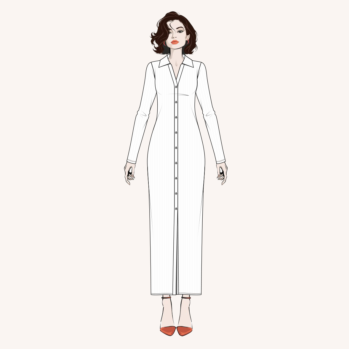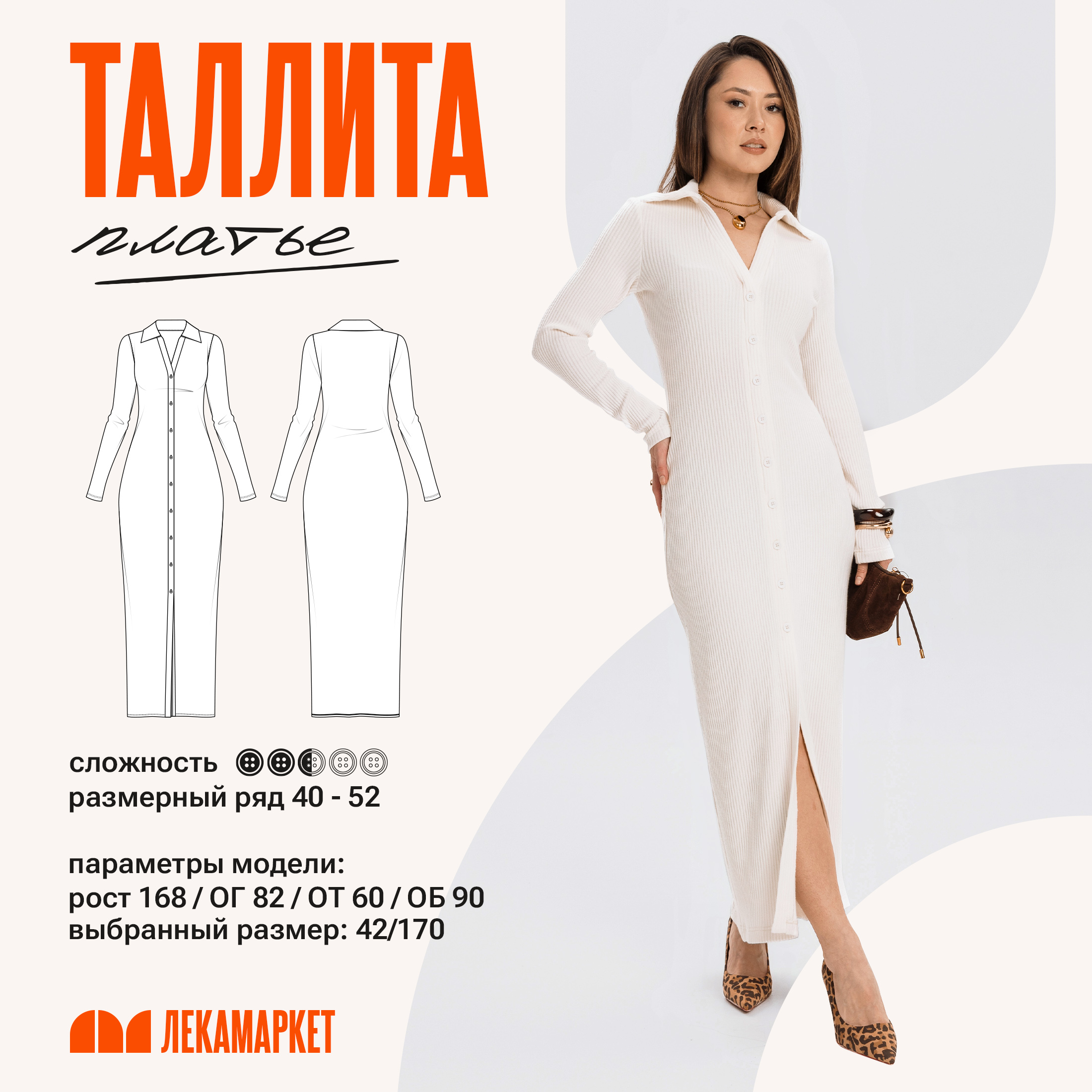 Трикотажное платье прилегающего силуэта, малого объёма. На полочке – имитация центральной застежки на притачных планках на петли и пуговицы. Горловина на полочке V-образной формы. Воротник отложной, с цельнокроенной стойкой. Рукав втачной, длинный. Длина платья до щиколотки.