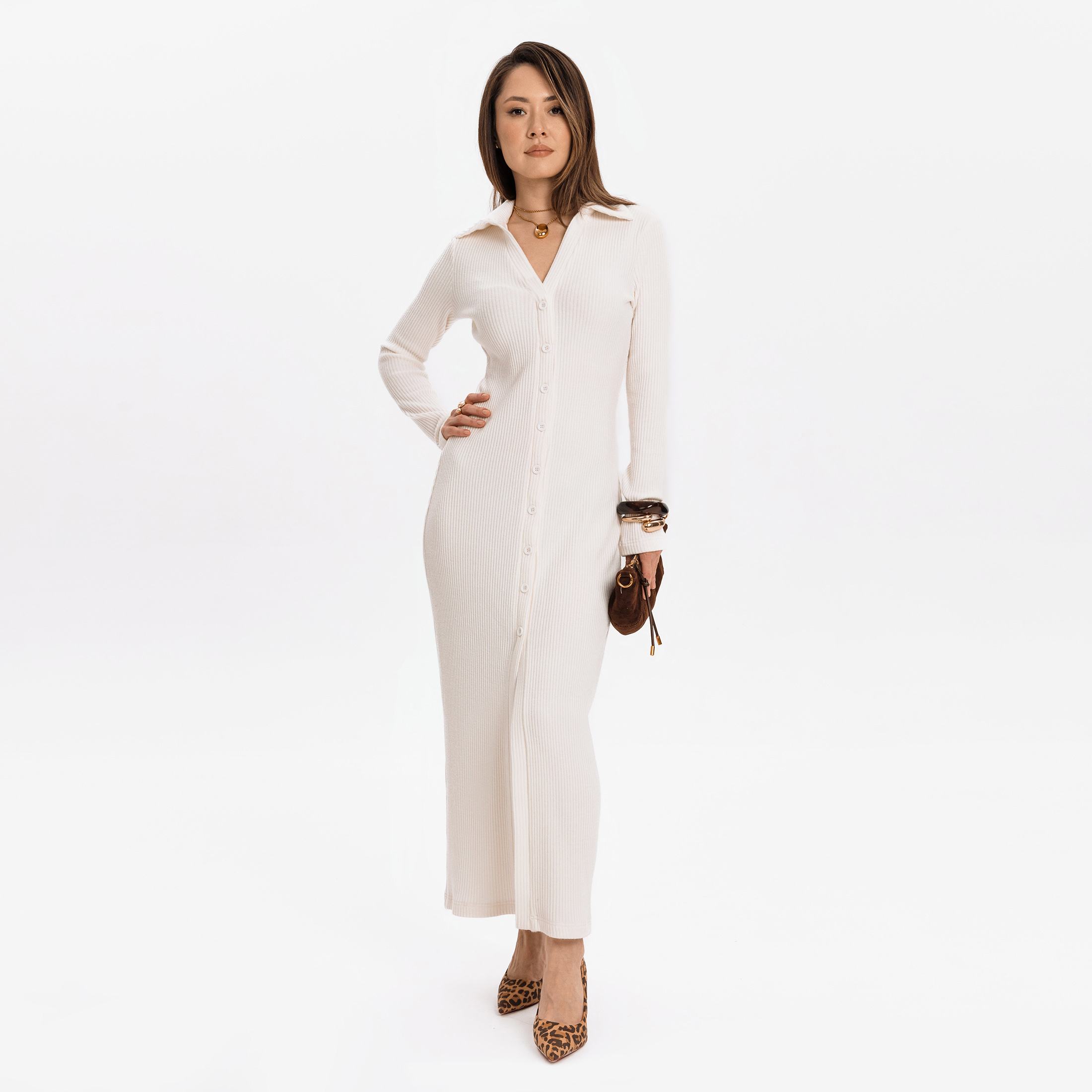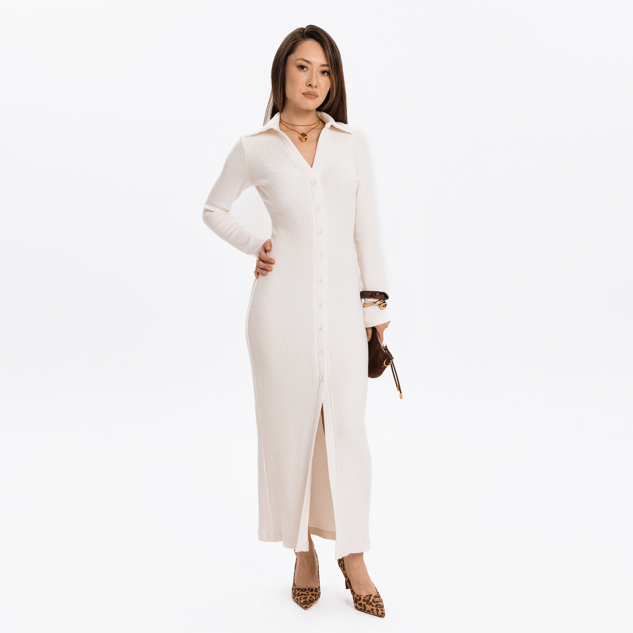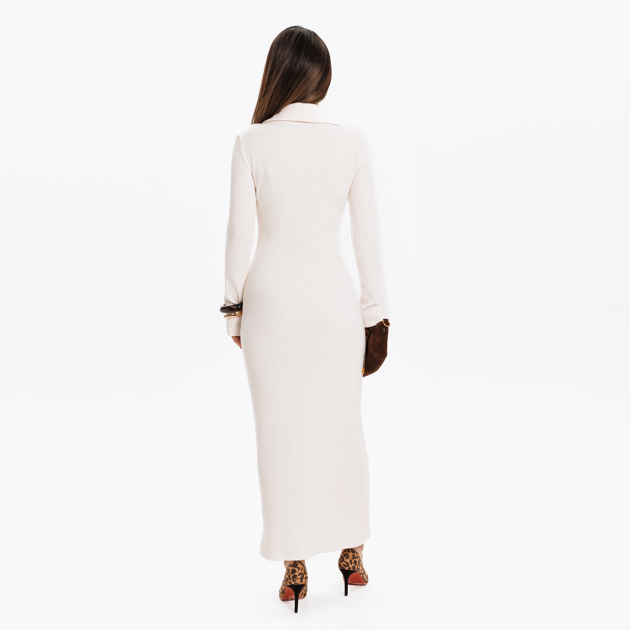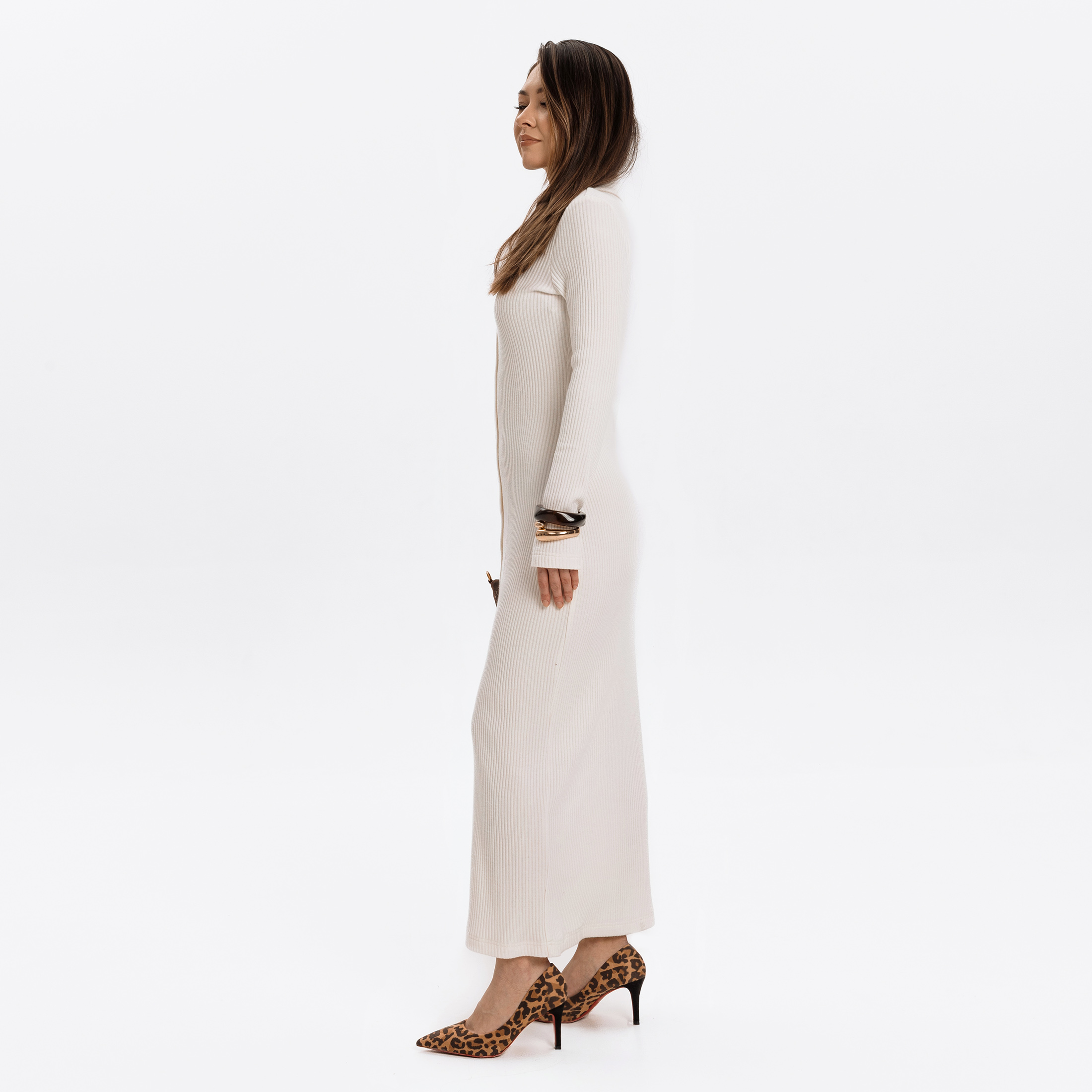 Трикотажное платье прилегающего силуэта, малого объёма. На полочке – имитация центральной застежки на притачных планках на петли и пуговицы. Горловина на полочке V-образной формы. Воротник отложной, с цельнокроенной стойкой. Рукав втачной, длинный. Длина платья до щиколотки.