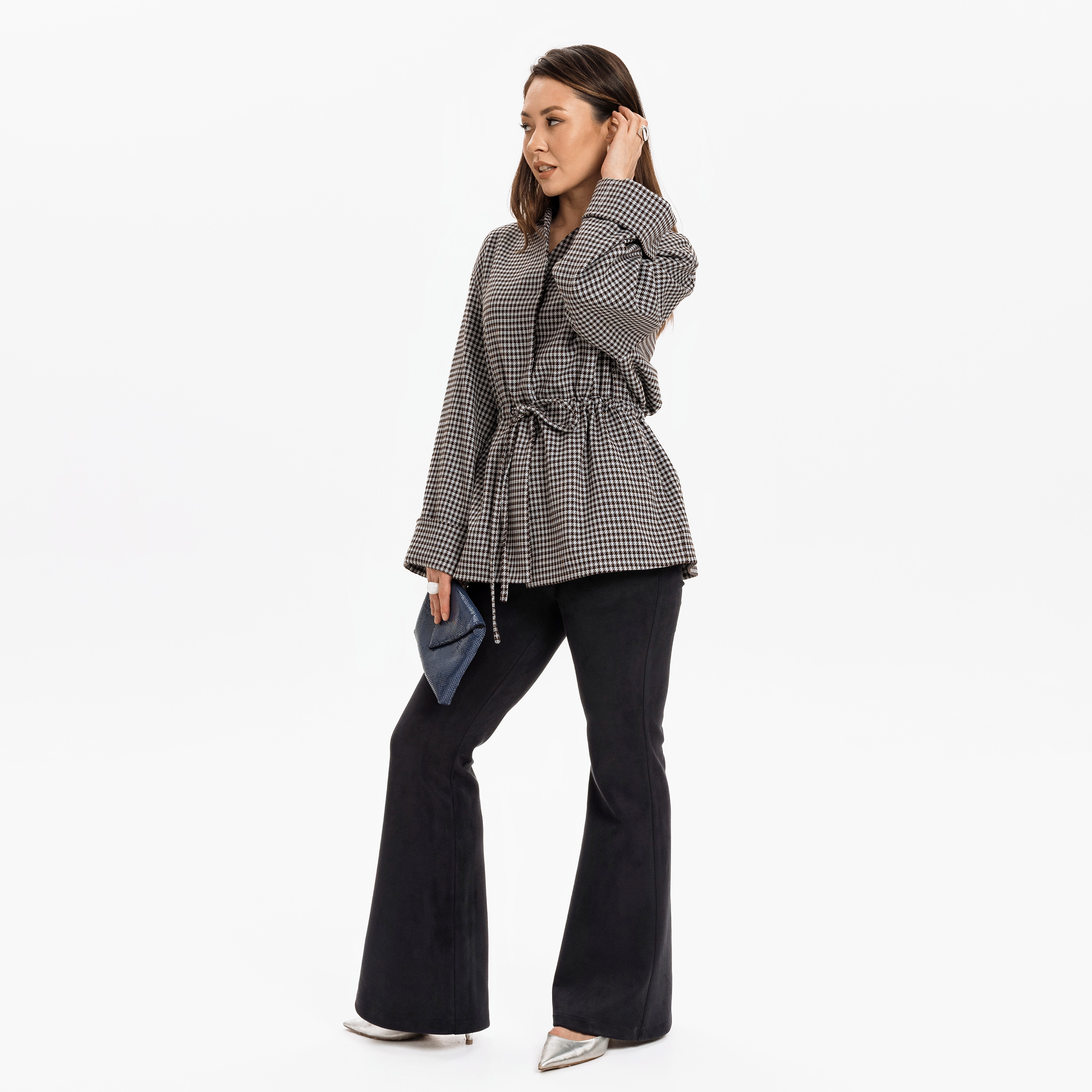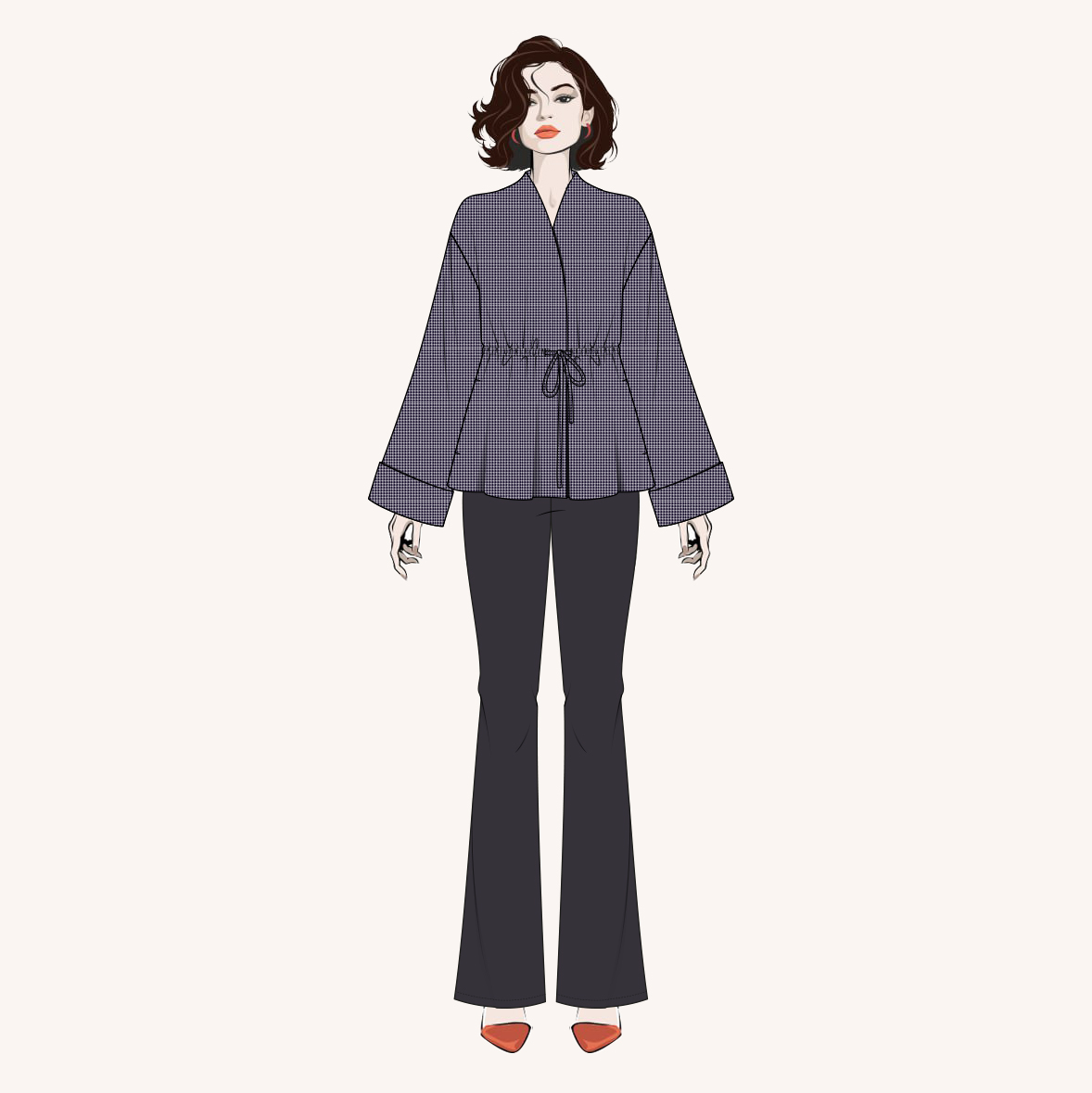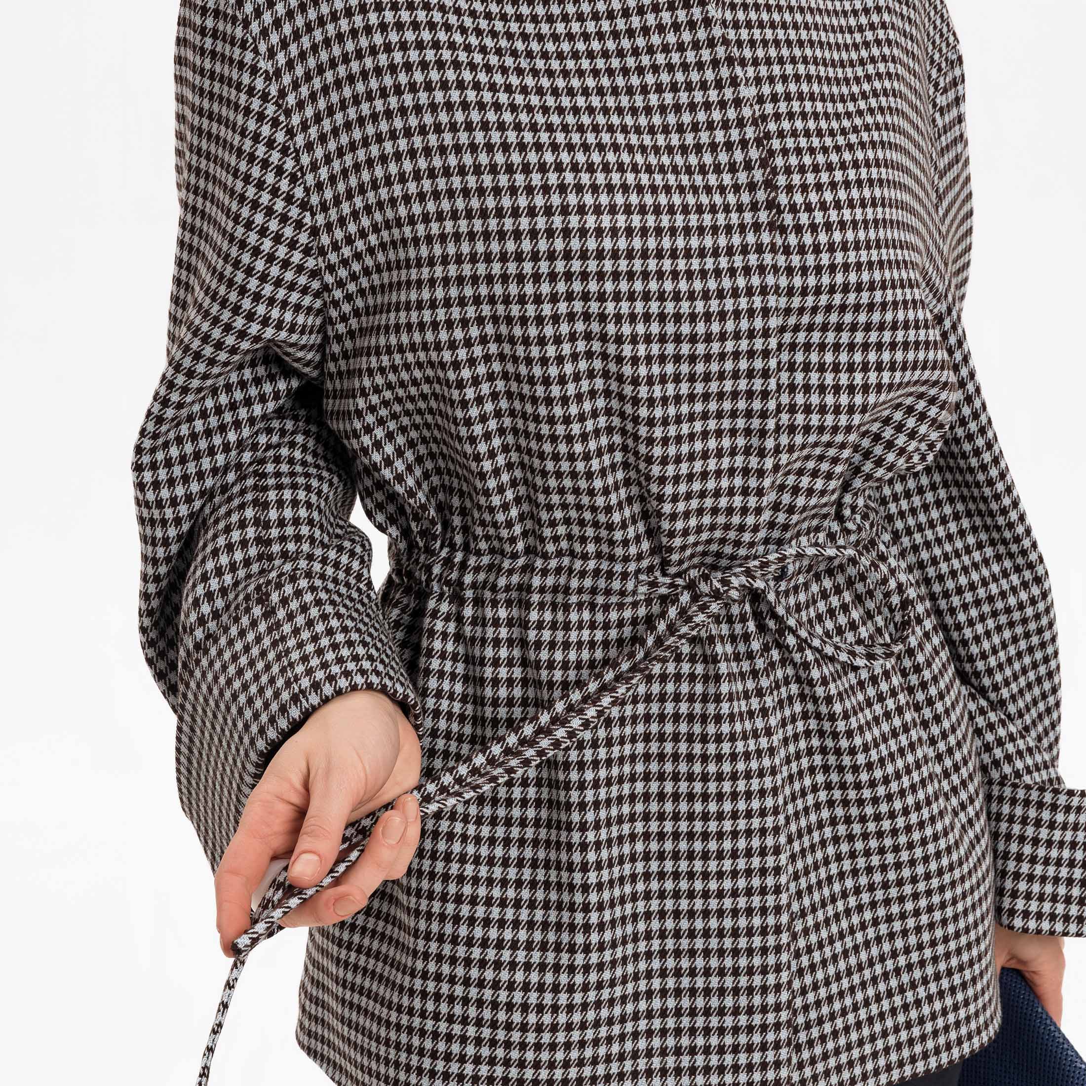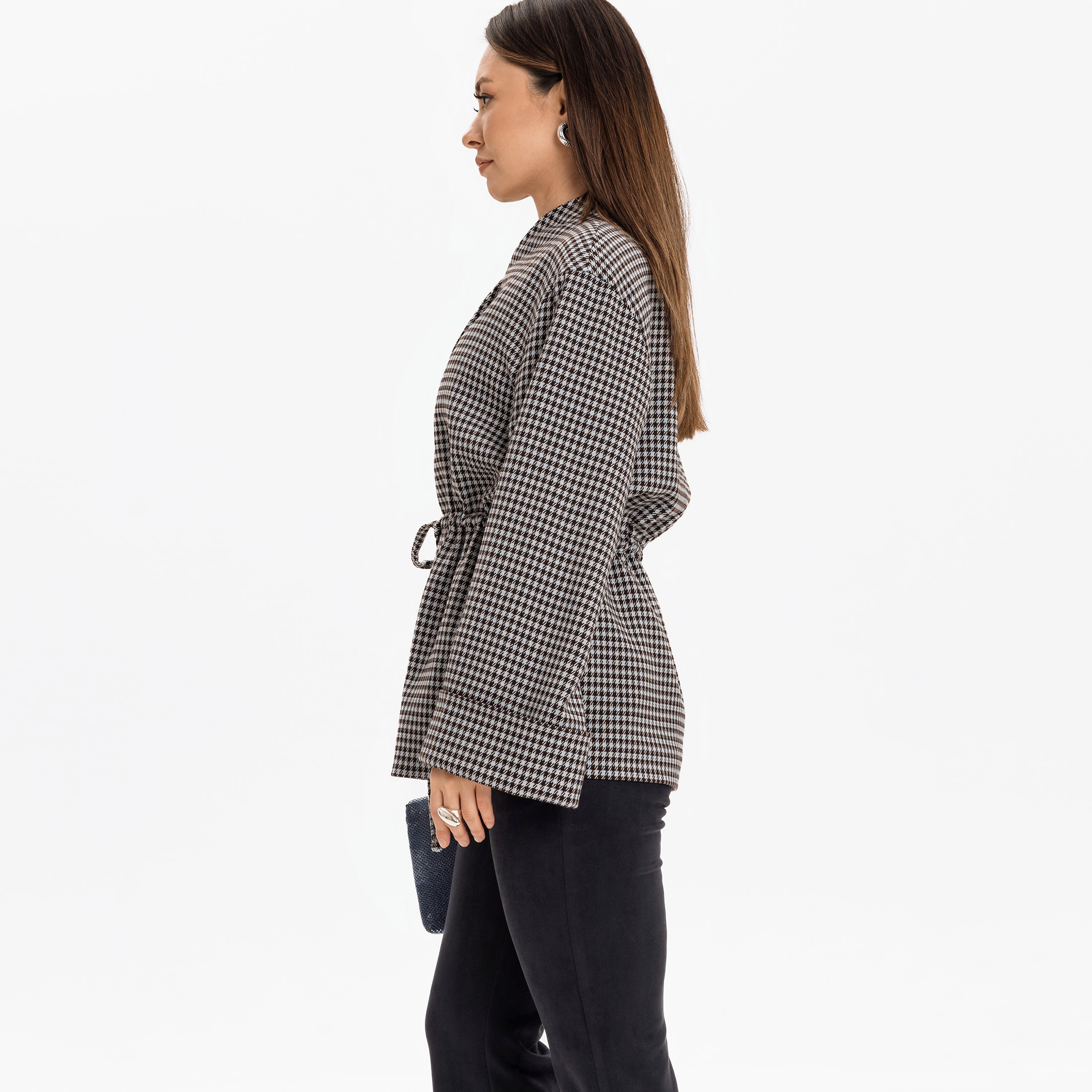 Однобортный жакет среднего объема, приталенного силуэта за счет кулисы на талии. Длина жакета чуть ниже линии бедер. На полочках и спинке, на уровне талии, расположена кулиса, внутри которой вставлен шнур. Шнур выполнен из основной ткани и продет через петли. В боковых швах расположены карманы. Застежка на пришивные кнопки. Воротник – цельновыкроенная стойка, высотой 3,0 см. Рукав втачной, длинный, широкий, с отворотом по низу. Жакет на притачной подкладке.