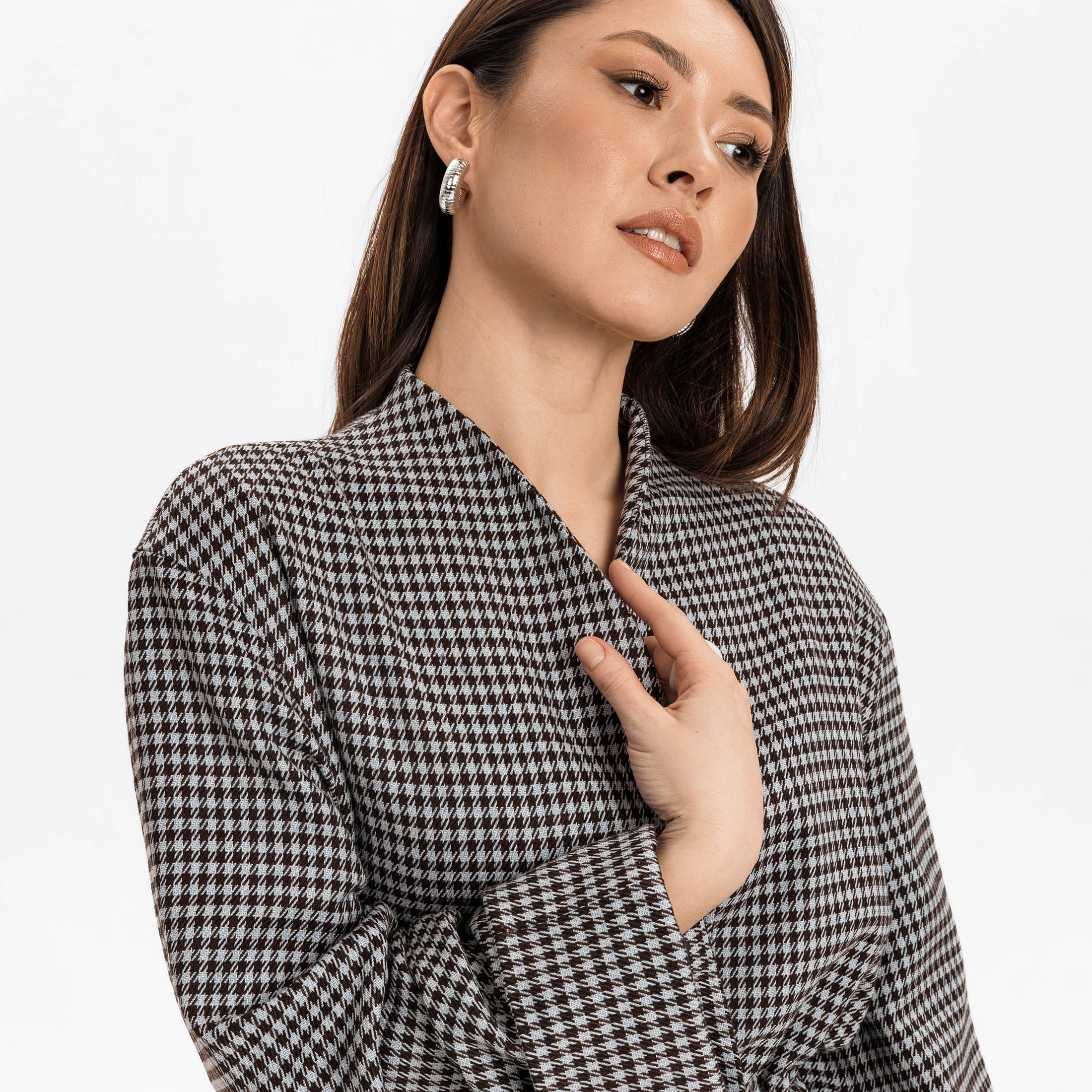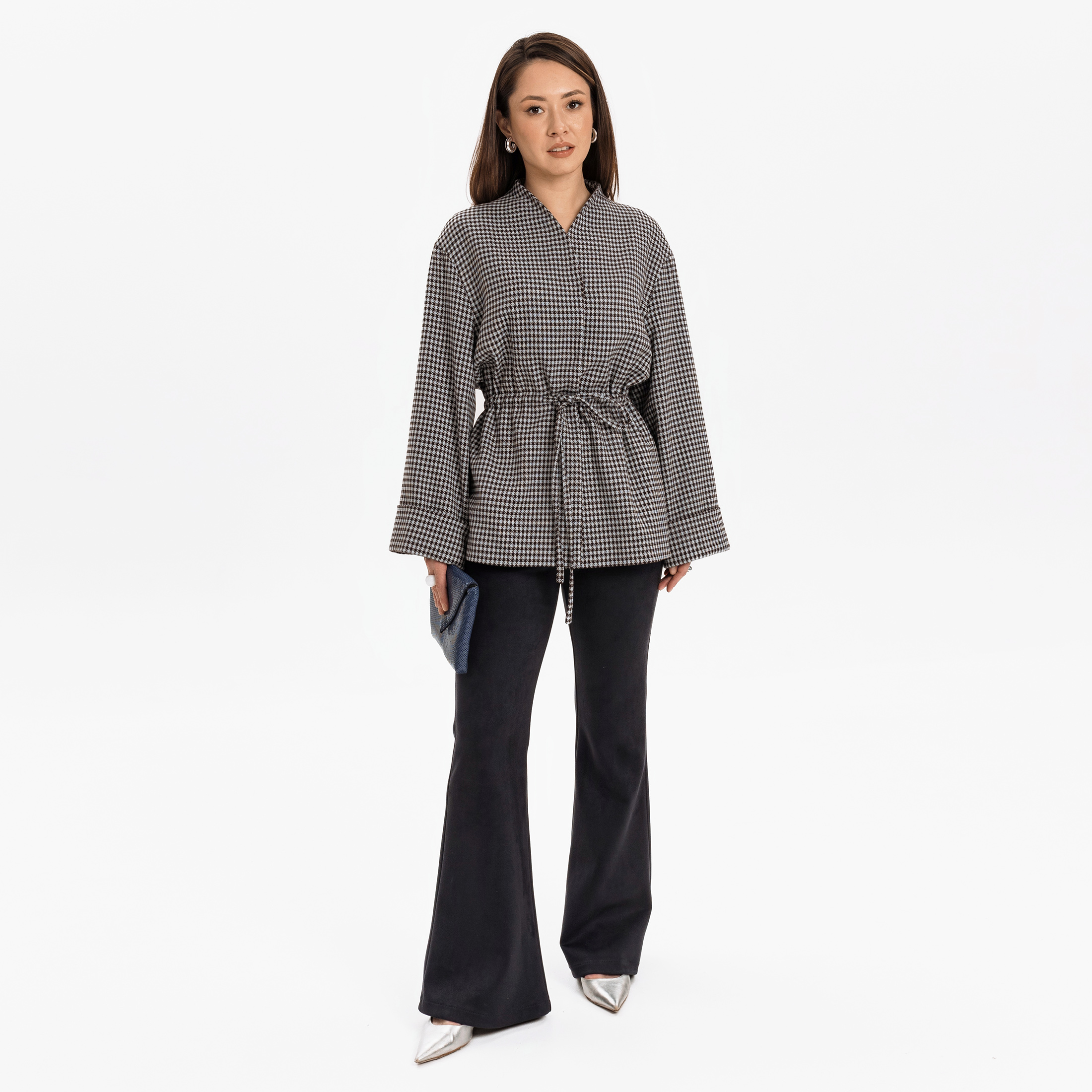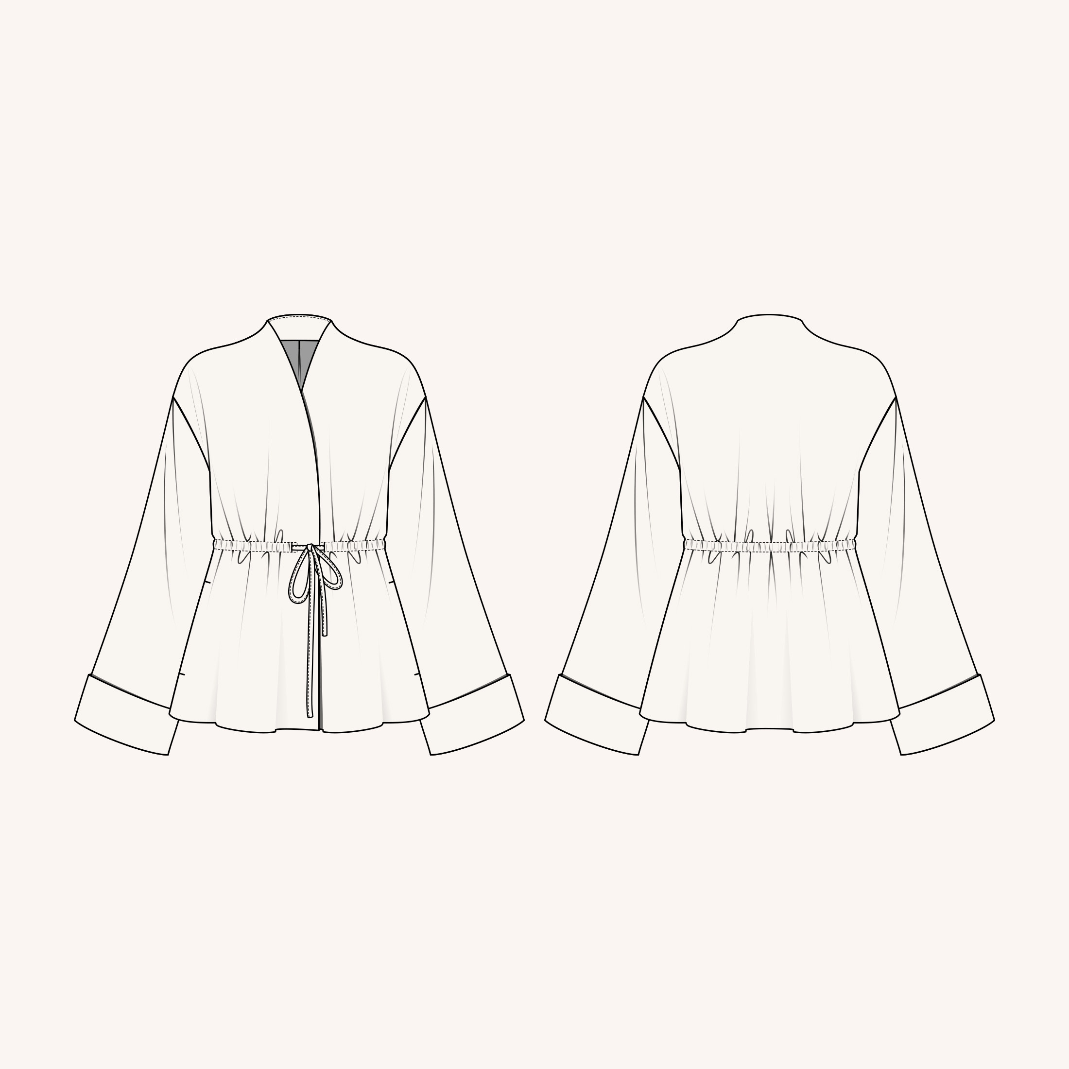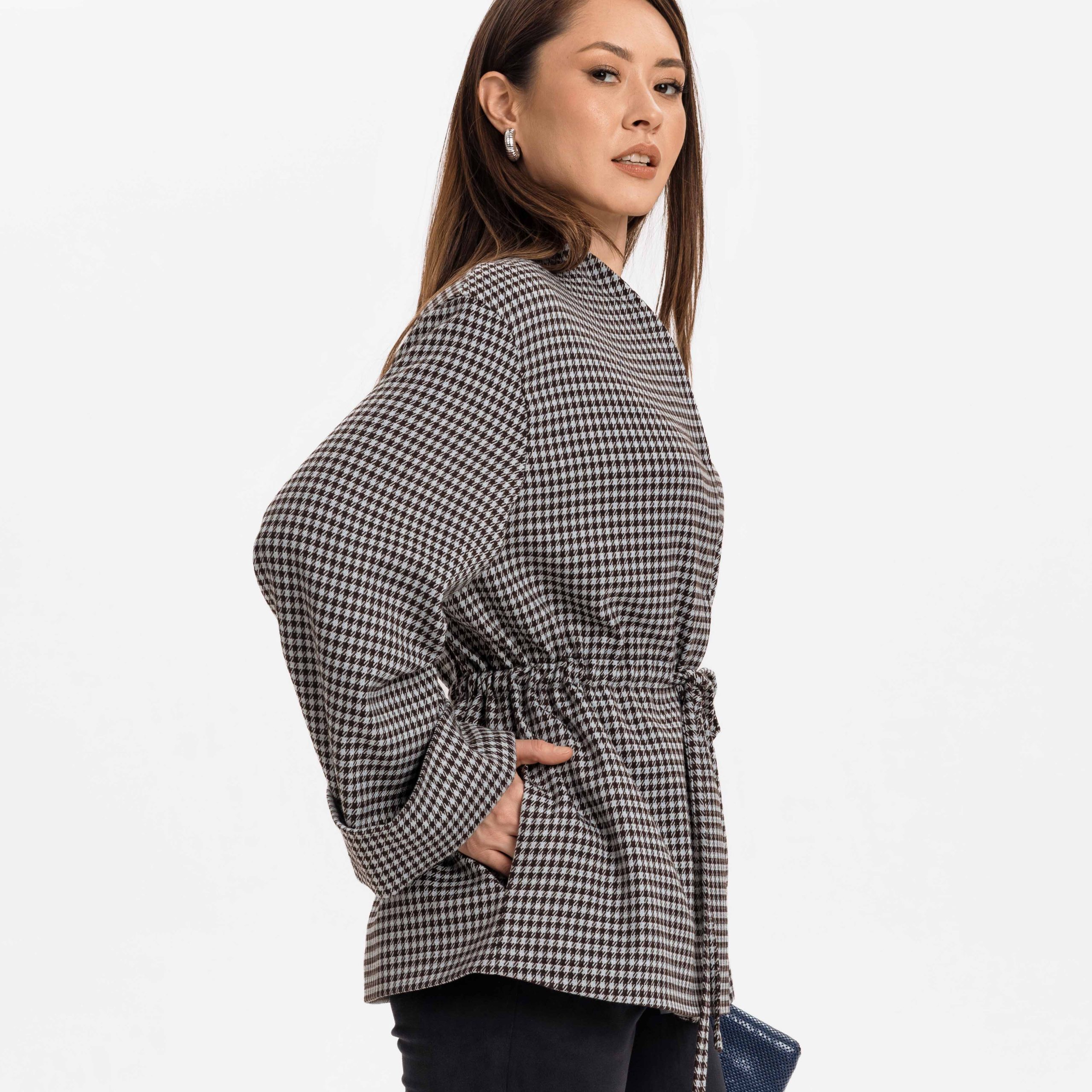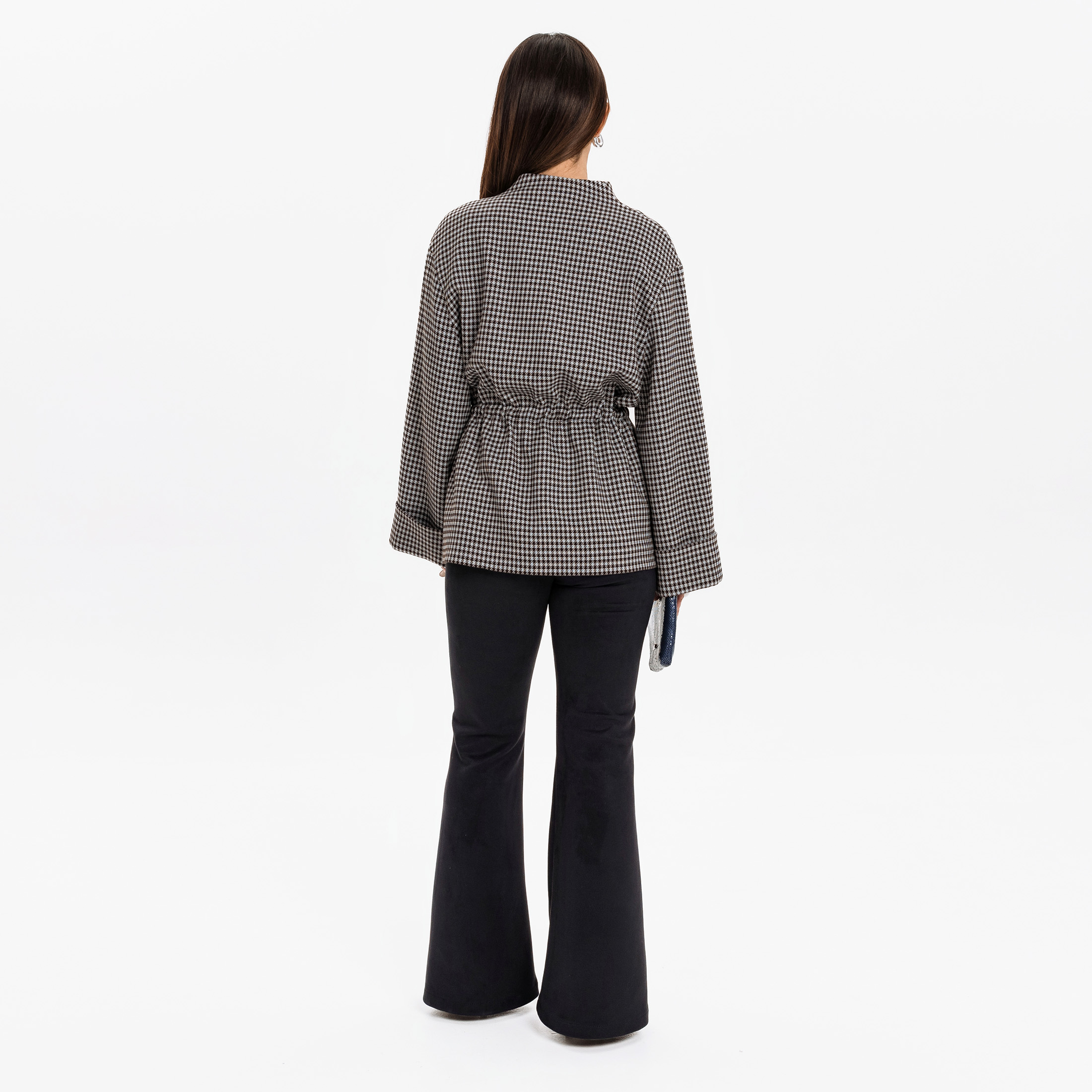 Однобортный жакет среднего объема, приталенного силуэта за счет кулисы на талии. Длина жакета чуть ниже линии бедер. На полочках и спинке, на уровне талии, расположена кулиса, внутри которой вставлен шнур. Шнур выполнен из основной ткани и продет через петли. В боковых швах расположены карманы. Застежка на пришивные кнопки. Воротник – цельновыкроенная стойка, высотой 3,0 см. Рукав втачной, длинный, широкий, с отворотом по низу. Жакет на притачной подкладке.